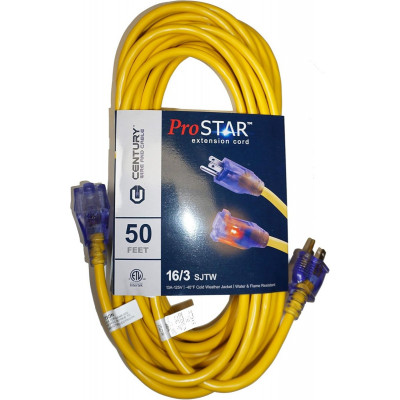 CENTURY WIRE & CABLE 16/3 50 Foot 13 Amp Yellow Sjtw Pro Power Extension Cord, Each